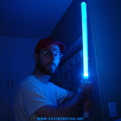 This is me looking rather unlike a Jedi but certainly brandishing a most impressive ToiletSabre. Make sure you tell someone in your house what you're doing because if they see a strang blue glow coming from the base of the bathroom door, they might start to wonder. Notice how nicely it lights up my entire washroom! Sure to strike fear into my enemies.